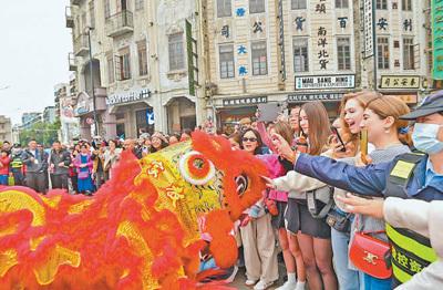 外国游客在广东汕头感受中国传统醒狮民俗。广东省文旅厅供图