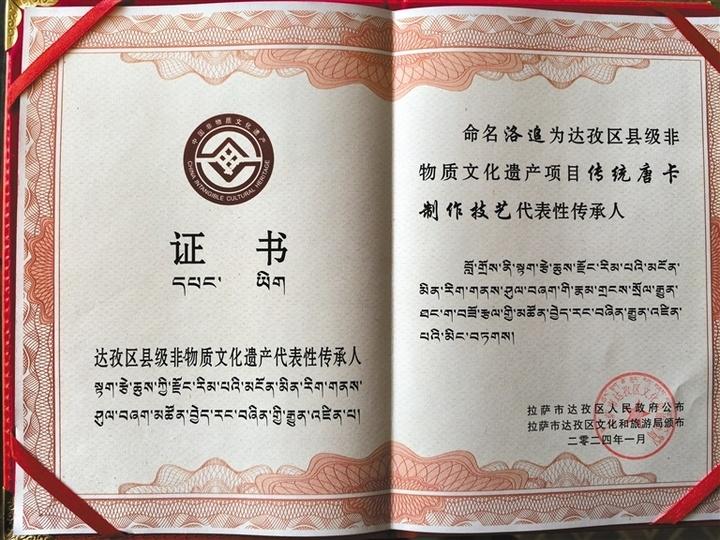 十多年来始终不懈地致力于唐卡艺术的传承工作,让洛追获得了不少奖项。2012年《大威德金刚》荣获2012年全国民族地区职业院校教学成果展演活动学生作品展览金奖,2014年获得高级技能证,2016年参加“指尖神韵”藏族唐卡大师丹巴绕旦师徒作品展,2017年获得第七届西藏唐卡艺术博览会“优秀唐卡画师”荣誉称号,2019年获得创新创业技能竞赛唐卡绘画金奖,2018年获得达孜区第三届青年创新创作大赛一等奖,2023年洛追成为达孜区县级非物质文化遗产项目传统唐卡制作技艺代表性传承人。