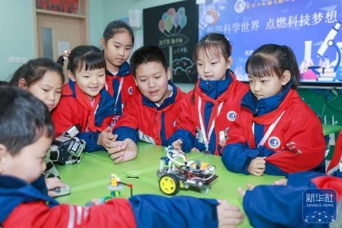 2月14日,在山东省枣庄市薛城区双语实验小学,学生们与编程机器人互动。新华社发(王龙飞摄)