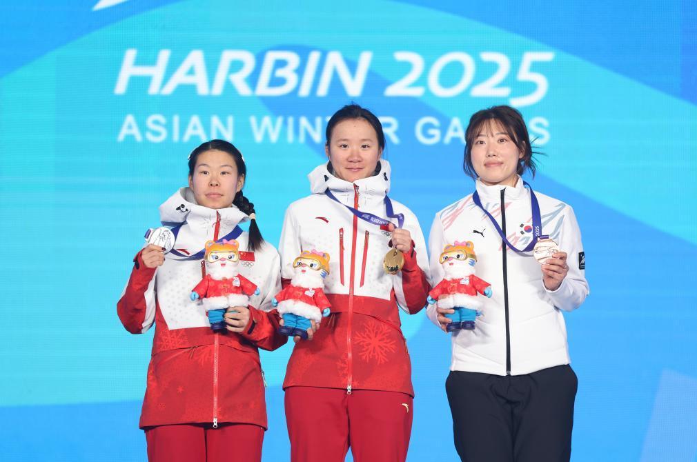 2月10日,第九届亚冬会速度滑冰女子3000米决赛在哈尔滨举行。中国选手杨滨瑜、韩梅、太智恩分别获得冠、亚、季军。新华社记者 王曦 摄