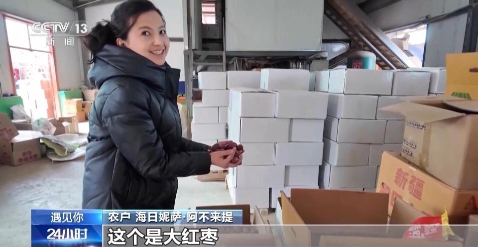农户海日妮萨·阿不来提:一月份到十二月份,每个月都有葡萄干,这个工厂里面,大红枣也有。你看这个是无核白葡萄干,这个是大红枣。