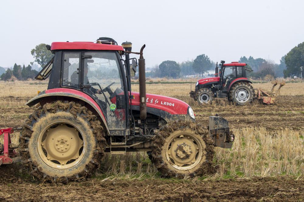 ■在江西省吉安市,农民翻耕整地,进行春播春种。