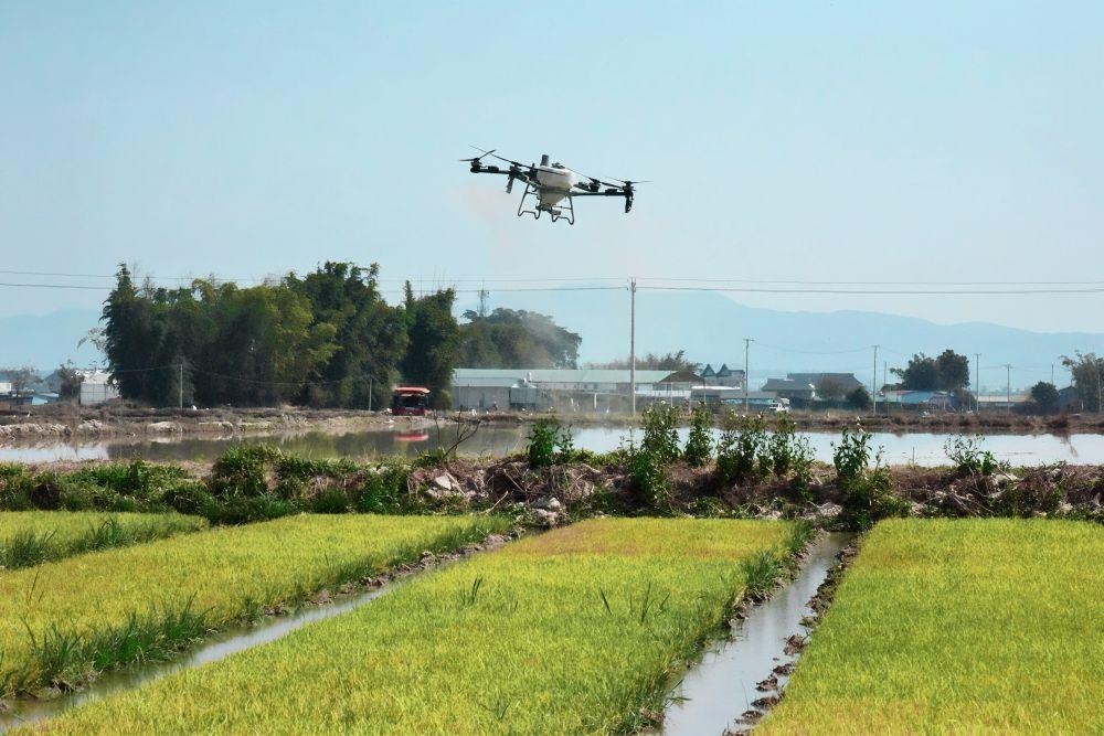 2月13日,无人机在云南省西双版纳傣族自治州勐海县田间给秧苗施肥。(新华社记者 王贤思摄)