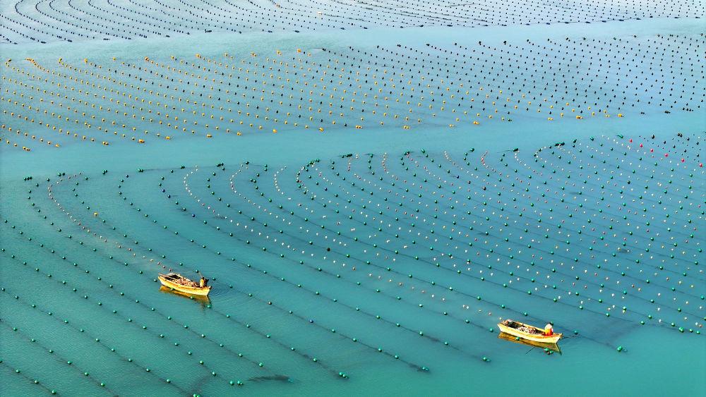 ■在山东省荣成市,海洋牧场的养殖工人驾驶养殖船开展海带春管、贝类养殖、浮漂更换等海上生产作业,呈现出一派“海上春耕”的繁忙景象。