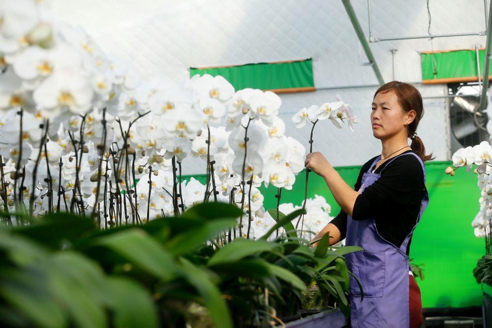 2月14日,平度市旧店镇万汇蝴蝶兰产业园的工人在管护蝴蝶兰。新华社发(梁孝鹏摄)