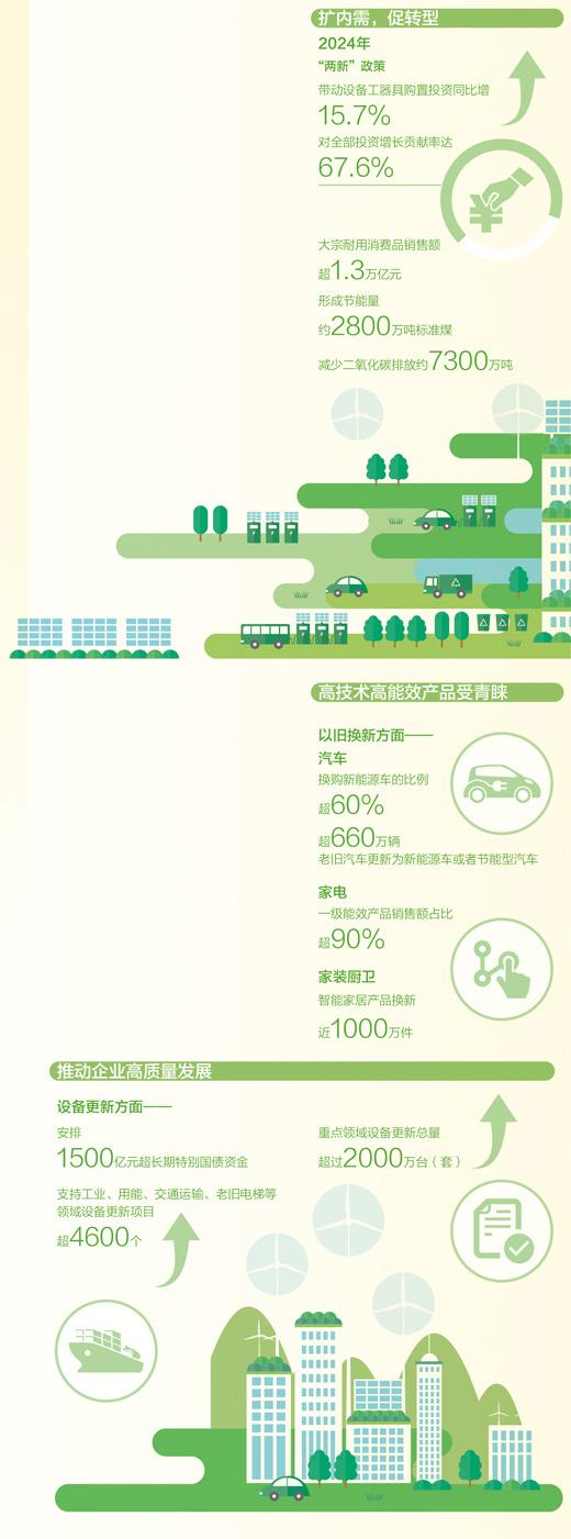 “两新”政策实施近一年来,居民消费需求更好释放、企业投资意愿更好激发。数据显示,2024年,“两新”政策带动设备工器具购置投资同比增长15.7%,对全部投资增长贡献率达到67.6%;带动大宗耐用消费品销售额超过1.3万亿元。消费与投资的增长共同推动内需扩大,政策成效逐步向供给端传导。
