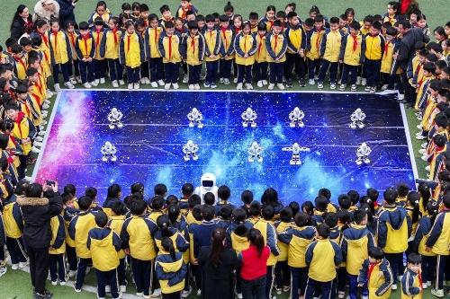 2月17日,在广西兴业县第一实验小学,学生们与机器人共舞。新华社记者曹祎铭摄