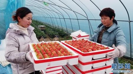 村民正在将草莓打包装箱。新华网发(赵怀勇 摄)