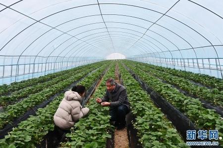 技术专家指导村民种植草莓。新华网发(赵怀勇 摄)