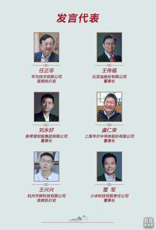 座谈会上,6位民营企业负责人代表先后发言,就新形势下促进民营经济发展提出意见和建议。《时政新闻眼》注意到,发言代表涵盖从“40后”到“90后”老中青三代。他们所在的企业来自不同领域行业,有着“科技”“创新”的鲜明标签。