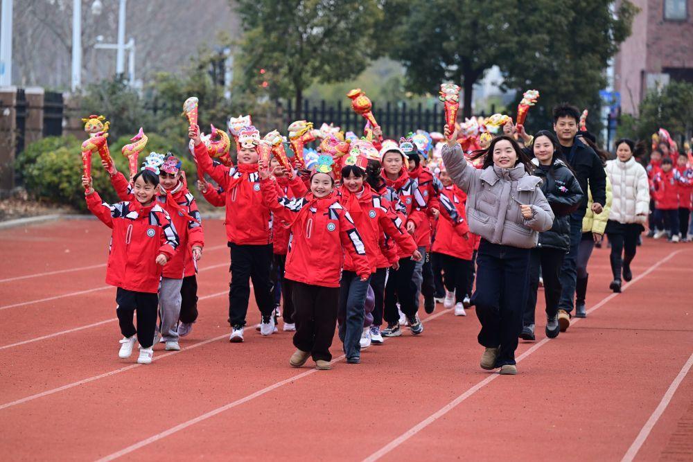 2025年2月14日,安徽省合肥市园上园小学喻岗分校师生在开学典礼上进行“贪吃蛇”接力跑活动。新华社记者 周牧 摄