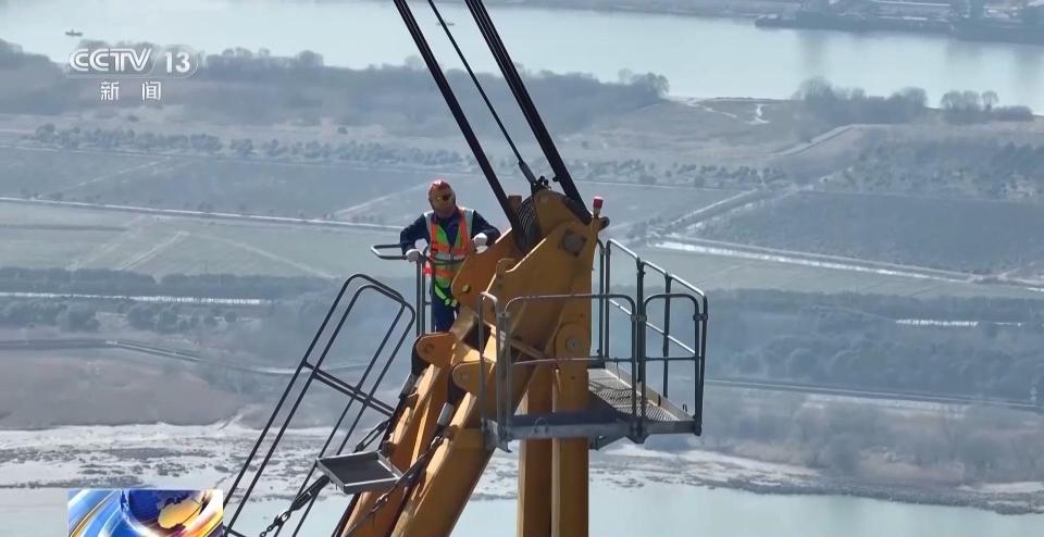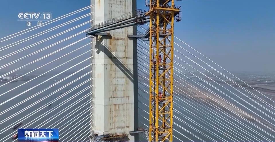总台央视记者 李伟代:这就是用于世界最大跨度斜拉桥桥塔施工的超高塔吊,常泰长江大桥高达350米的主塔已经建成,师傅们徒手在塔吊上继续攀爬120米,到达离江面380米的塔吊顶端,对塔吊进行拆除前的全面检查。
