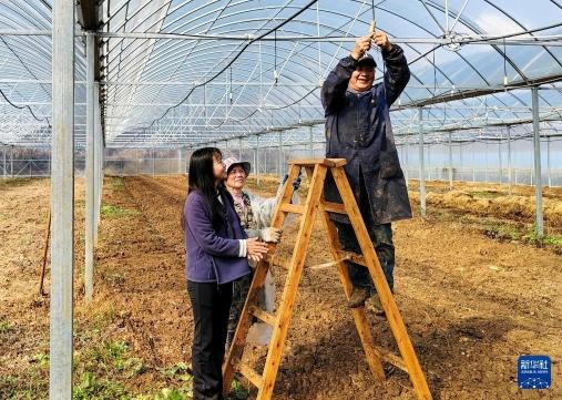 2025年2月18日,在湖北省赤壁市中伙铺镇安丰村,田淑娴(左)指导村民对大棚喷灌设备进行检修。