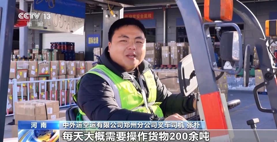河南航空货运发展有限公司国际业务部出发仓管 邢亚栋:新年以来货量急剧猛增,之前的5台安检机已经不能满足需求,今年我们已增开至7台,24小时不间断入货。2024年我们的货量已经突破了80万吨,2025年希望我们突破100万吨。