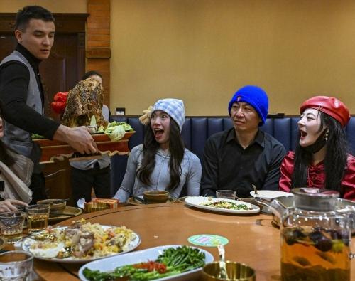 1月28日,雪友们在阿勒泰市区一家餐厅吃年夜饭。新华社记者 陈朔 摄