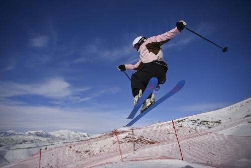 1月28日,即农历除夕当天,雪友在滑雪公园飞越跳台。新华社记者 胡虎虎 摄