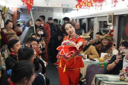 演职人员(中)在哈尔滨开往漠河的K7041次列车车厢中进行民俗表演(2025年1月11日摄)。新华社记者 王松 摄