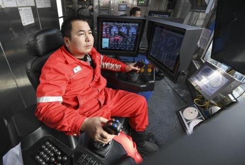 2025年2月19日,司钻在中国石油塔里木油田深地塔科1井上操作设备。新华社记者胡虎虎摄