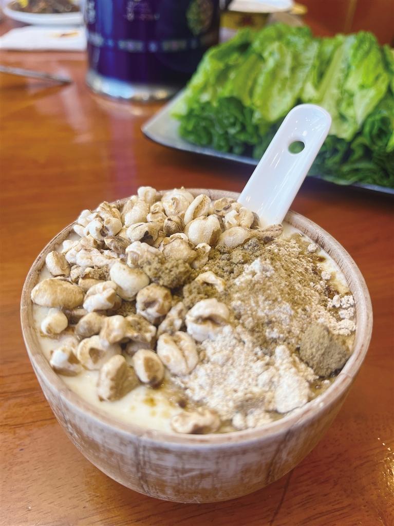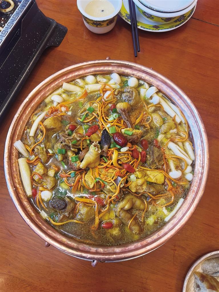 传统的藏式牦牛肉火锅讲究原汁原味,汤底通常选用牦牛骨熬制数小时,加入少许盐和香料即可。锅底先铺上一层时蔬和粉丝,再铺一层牦牛肉排,最上面是土豆、萝卜、白菜、青笋、木耳等耐煮的蔬菜,再加上肥瘦相间的新鲜牦牛肉慢慢炖煮。各类食材的香味相互碰撞,别提多香了!为了不掩盖食物本身的香气,藏式牦牛肉火锅的蘸料通常比较简单,可以用辣椒酱、葱花、香菜等调制,也可以根据个人喜好加入芝麻酱、腐乳等。牦牛肉火锅味道浓郁,建议搭配清淡的酥油茶或甜茶等饮品。