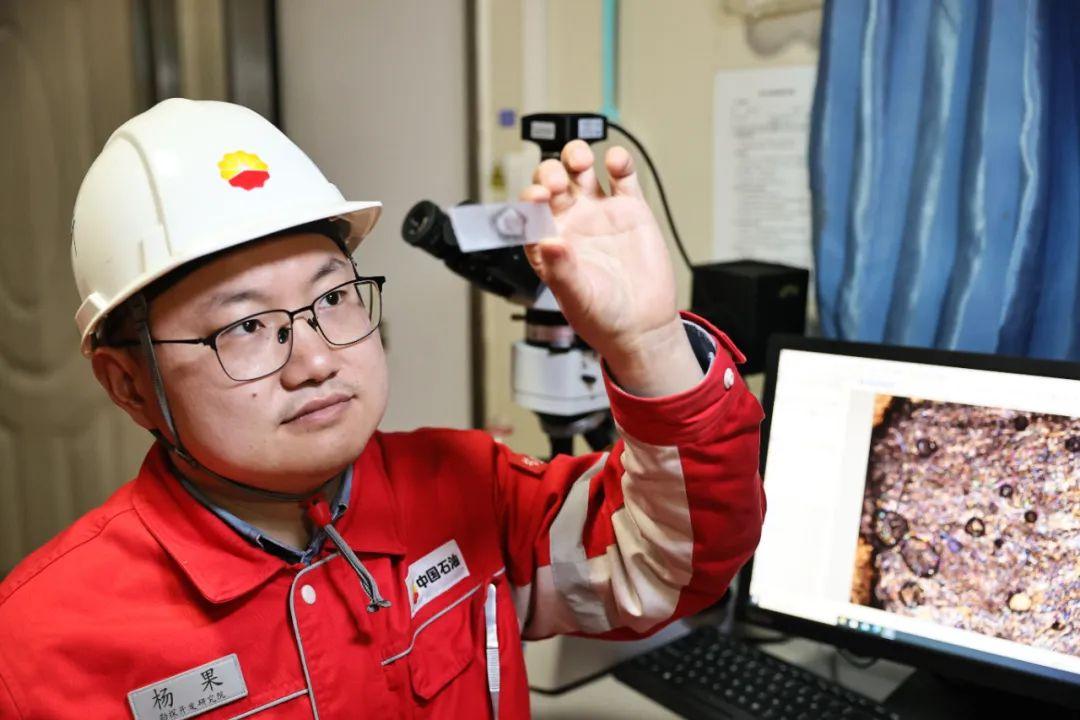 塔里木油田勘探开发研究院基础研究部课题经理杨果在观察岩屑磨出来的岩石薄片(资料图片)。陈士兵摄
