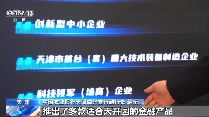 中国农业银行天津南开支行副行长 韩乐:园区内九成以上都是初创期民营企业。我们针对园区企业的特点,推出了多款适合天开园的金融产品。同时我们还积极帮助企业进行投融资方面的撮合对接,与中小担保公司加强合作,解决这类企业中长期的大额的融资需求。