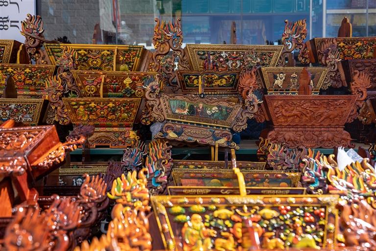 “老板,这个切玛盒多少钱?便宜点我就拿走了。”“这个图案样式都是精心雕刻的,最低1300元,实在不能再少了。”次仁的店铺前,不少顾客正在挑选“切玛盒”,生意很是火爆。“切玛盒”是将精制斗形木盒用隔板分开,左右两边分别盛入炒青稞和糌粑,再插上象征五谷丰登的“罗萨梅朵”和寓意吉祥的酥油花,寓意人寿年丰、吉祥如意,是藏历新年家家户户必备的年货之一。次仁告诉记者,“切玛盒”根据图案、颜料、大小、木材等因素,售价从几百元到上千元不等,很多顾客普遍喜爱传统样式与图案。