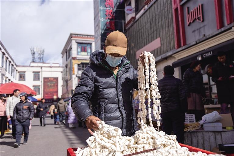 在拉萨市城关区八廓商城,绒布烫金的藏式对联、色彩艳丽的“罗萨梅朵”……花样繁多的各类年俗用品与传统年货吸引了众多市民群众前来选购。