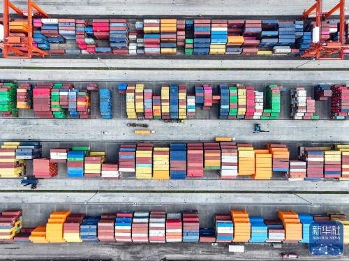 ↑2月25日,卡车在重庆两江新区果园港运送集装箱(无人机照片)。
