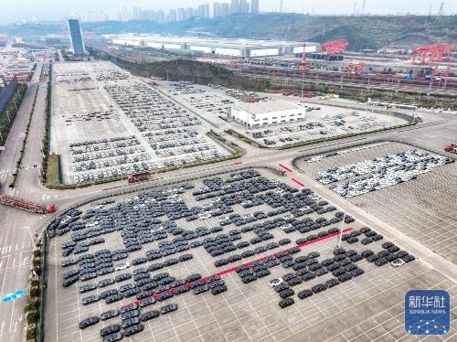 ↑这是2月25日拍摄的重庆两江新区果园港停放的商品车(无人机照片)。