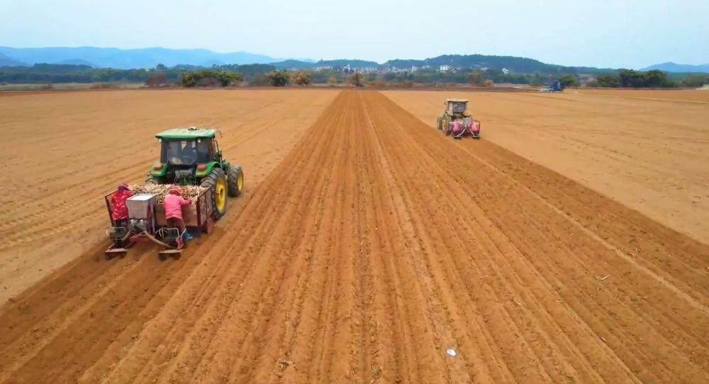 在广西来宾市兴宾区凤凰镇国家现代农业产业园黄安优质“双高”糖料蔗基地,大型拖拉机、甘蔗种植机同步作业。新华社发