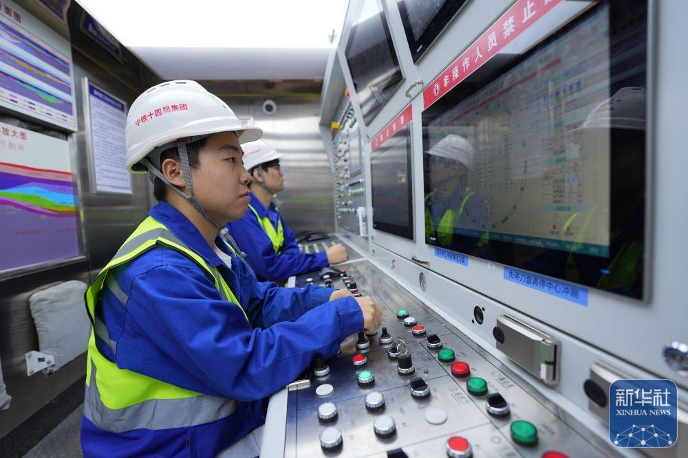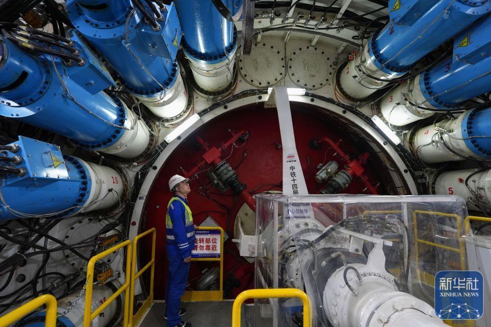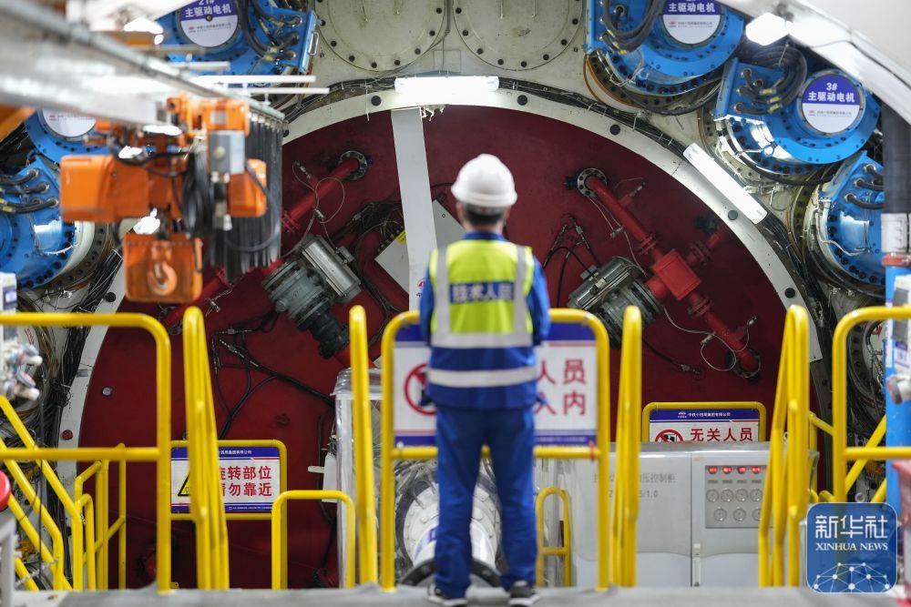 ↑ 2月25日,中铁十四局技术人员在甬舟铁路金塘海底隧道“甬舟号”盾构机内关注设备运行情况。