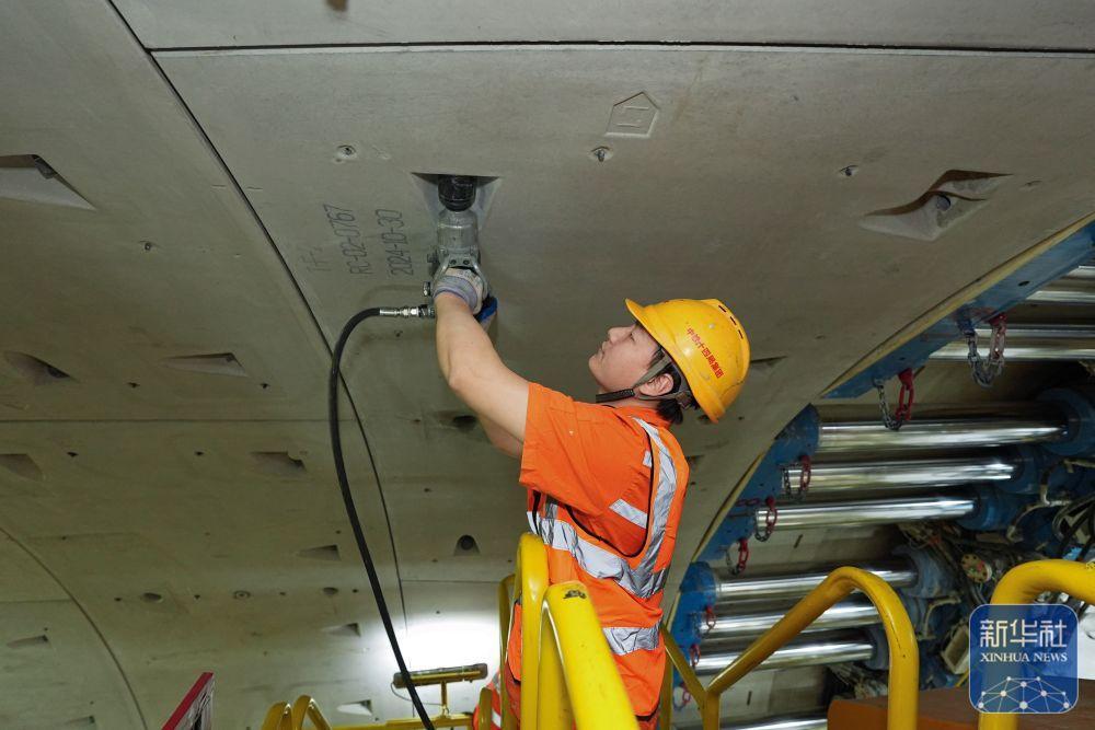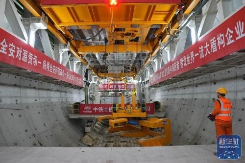 ↑ 2月25日,中铁十四局施工人员在甬舟铁路金塘海底隧道“甬舟号”盾构机内进行管片拼装作业。