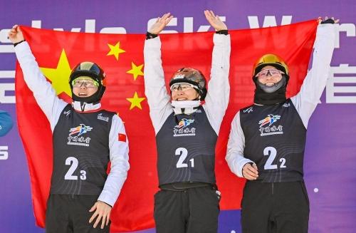 2月24日,在2024-2025赛季国际雪联自由式滑雪世界杯(北大湖站)空中技巧混合团体决赛中,由徐梦桃、李天马、齐广璞组成的中国一队获得金牌。图为中国一队徐梦桃(中)、李天马(右)、齐广璞在颁奖仪式上。新华社记者 颜麟蕴 摄