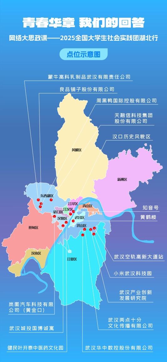 “青春华章·我们的回答”网络大思政课——2025全国大学生社会实践团湖北行调研点位示意图。