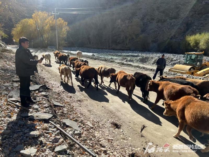 2月24日,和静县克尔古提乡那音特村牧民李加拉,将自己家的53头牛从冬牧场转场至春草场。通讯员 乌努尔摄