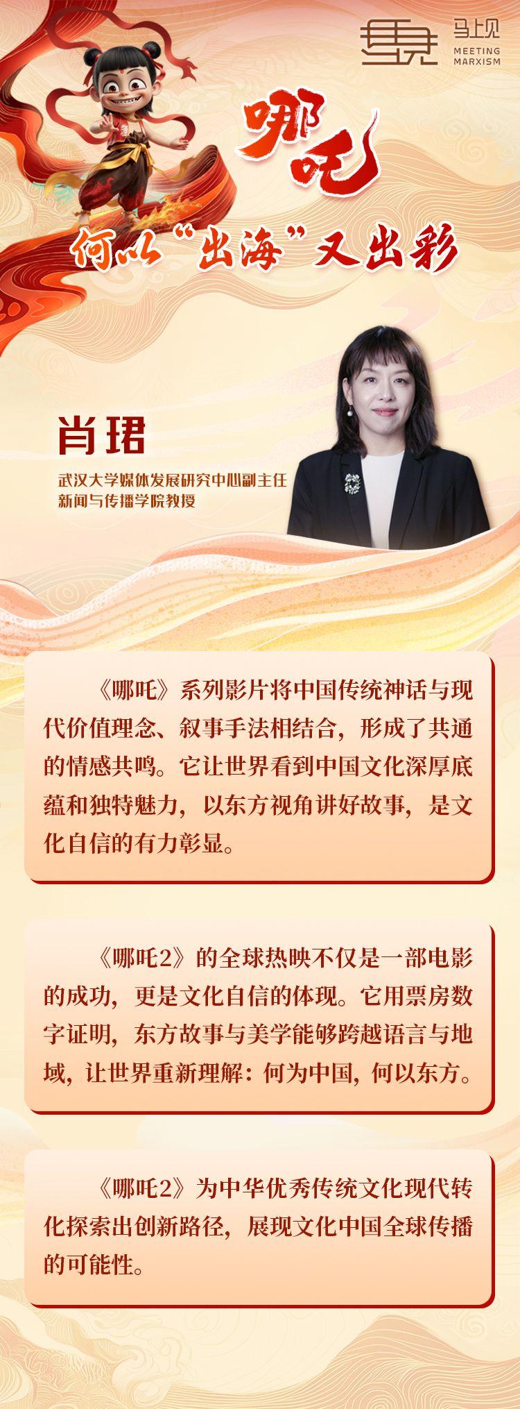 登顶全球电影单一市场票房榜、登顶全球动画电影票房榜……《哪吒2》自上映以来不断冲榜。在湖北省委网信办的指导下,荆楚网(湖北日报网)联合武汉大学马克思主义学院“马上见”团队,邀请武汉大学媒体发展研究中心副主任、新闻与传播学院教授肖珺,以及湖北美术学院影视动画学院副教授周罡,一起来聊聊这部创造神话的中国动漫电影。