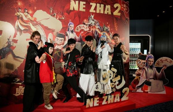 2月11日,澳大利亚悉尼,观众在《哪吒之魔童闹海》巨幅海报前拍照。(图片来源:新华社)