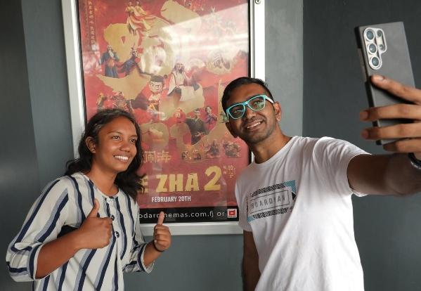 2月20日,斐济首都苏瓦,观众在《哪吒2》电影海报前自拍。(图片来源:新华社)