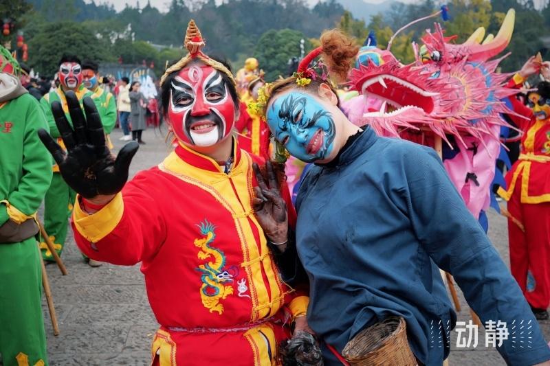 湖南游客金子微和家人从湖南驾车来到古城,体验了一把画花脸,她兴奋地告诉记者:“驾车过来就是想感受一下这边的年味儿,最期待的就是花脸龙表演。”