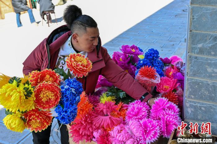 2月27日,知诗春批选购装饰居室的工艺花卉,迎接藏历新年的到来。李嘉娴 摄