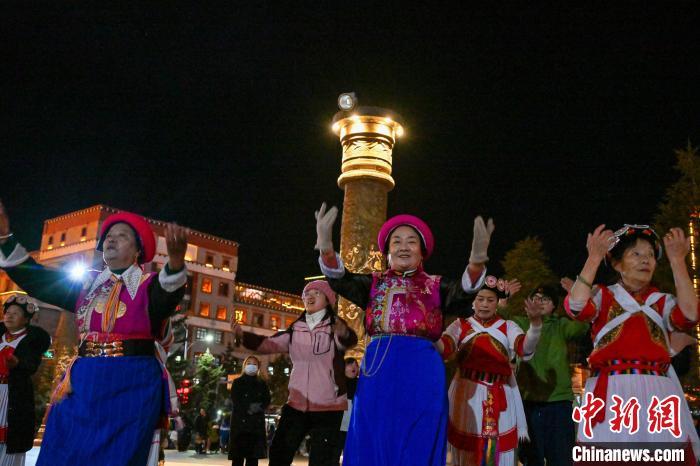 2月27日晚,藏族、傈僳族、纳西族、彝族等各族民众在云南省迪庆藏族自治州迪庆民族文化广场载歌载舞,欢庆藏历新年的到来。李嘉娴 摄