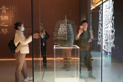 △2月26日,游客在西部机场博物馆珍宝馆内参观国家一级文物“秦公镈”。