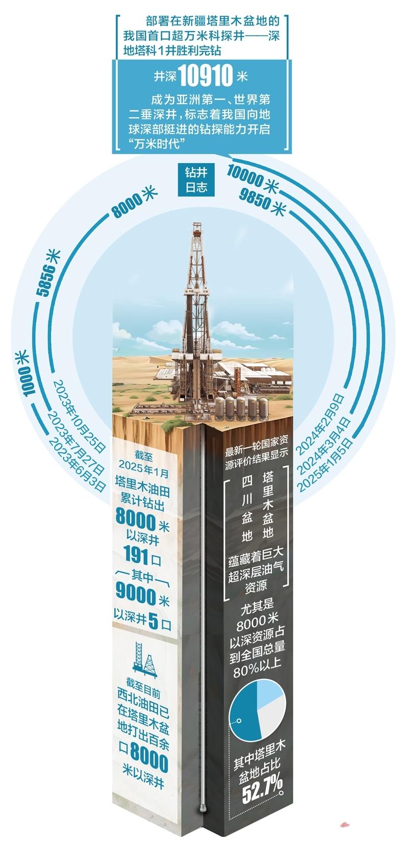 向地球深部挺进,“十四五”以来,塔里木油田和西北油田在塔里木盆地钻井深度从8000余米升级到9000米,再到现在的10910米。