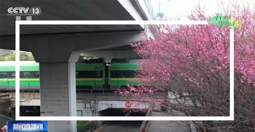 从早晨开始,每隔十几分钟就有一辆列车从杭州站驶出,在眼前盛开的粉梅旁穿行而过,宛如电影中定格的诗意画面,吸引了不少市民游客前来打卡。