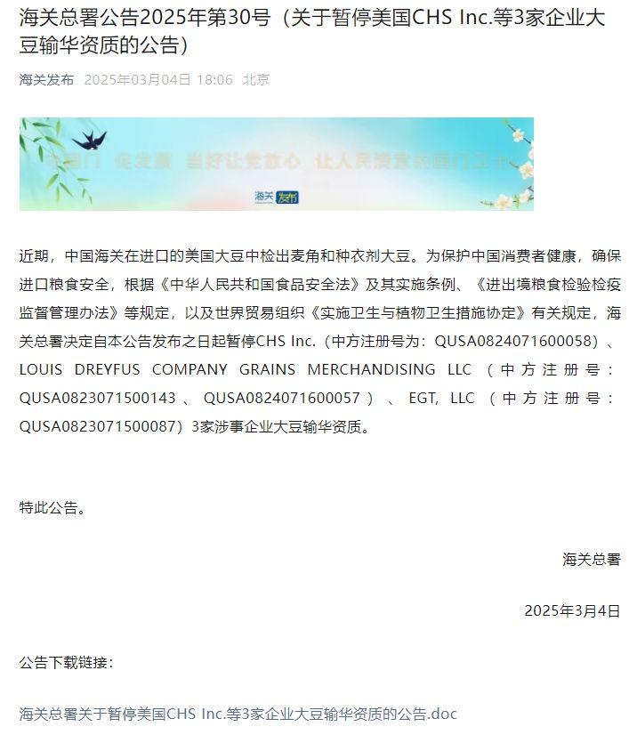 近期,中国海关在进口的美国大豆中检出麦角和种衣剂大豆。为保护中国消费者健康,确保进口粮食安全,根据《中华人民共和国食品安全法》及其实施条例、《进出境粮食检验检疫监督管理办法》等规定,以及世界贸易组织《实施卫生与植物卫生措施协定》有关规定,海关总署决定自本公告发布之日起暂停CHS Inc.(中方注册号为:QUSA0824071600058)、LOUIS DREYFUS COMPANY GRAINS MERCHANDISING LLC(中方注册号:QUSA0823071500143、QUSA0824071600057)、EGT, LLC(中方注册号:QUSA0823071500087)3家涉事企业大豆输华资质。