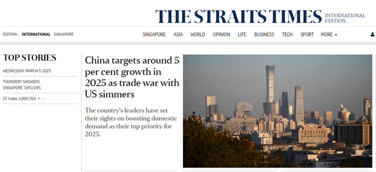新加坡《海峡时报》也在网站首页头图置顶发布了中国两会相关报道。报道指出,中国将2025年经济增长目标设定为约5%,并计划通过更强有力的财政支持推动增长。报道称这一目标“雄心勃勃”,并预计中国政府工作报告中提到的人工智能等新兴产业将成为两会期间代表委员们讨论的重点。