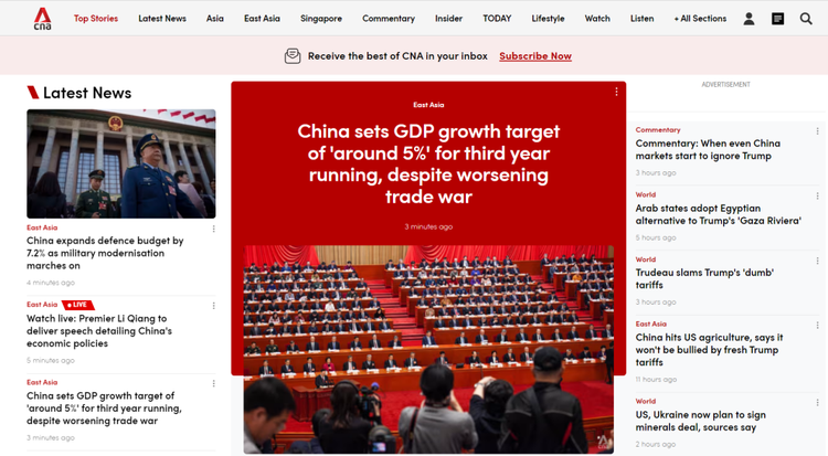 新加坡亚洲新闻台(CNA)围绕中国两会刊发多篇头条报道与专家评论,并在网站首页专区实时转播了十四届全国人大三次会议开幕会。CNA报道涵盖中国2025年GDP增长目标、国防预算,以及针对科技创新和民营经济两大具体领域的工作部署等,并特别关注到政府工作报告中提及的“低空经济等新兴产业”。亚洲新闻台指出,自2023年以来,中国一直保持5%左右的经济增长目标,这表明在国际贸易紧张局势和全球不确定性加剧的背景下,中国依然对经济增长充满信心。今年中国财政赤字率拟按4%左右安排,这体现出政府将更加专注于提振内需,提高民生福祉,刺激消费以应对关税摩擦带来的影响。