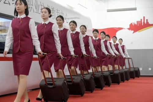 2024年5月17日,河北省承德县综合职业技术教育中心高铁乘务班学生在参加礼仪服务实训。近年来,该中心以就业市场需求为导向,增设了高铁乘务和新能源汽车维修等课程,采取“校企合作”“工学一体”的办学模式,订单式培养行业所需的专业技术人才。
