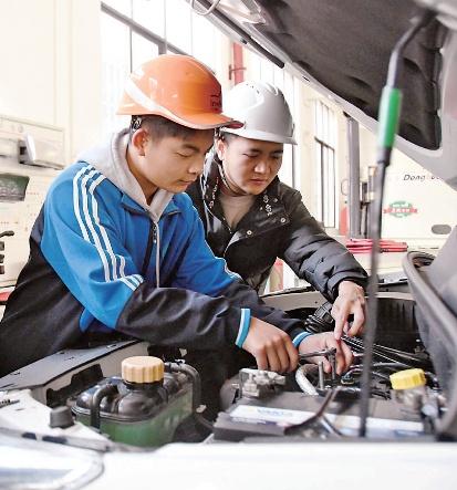 湖南省永州市江永县职业中专学校的老师在指导学生进行汽修实践操作。田如瑞 摄/光明图片