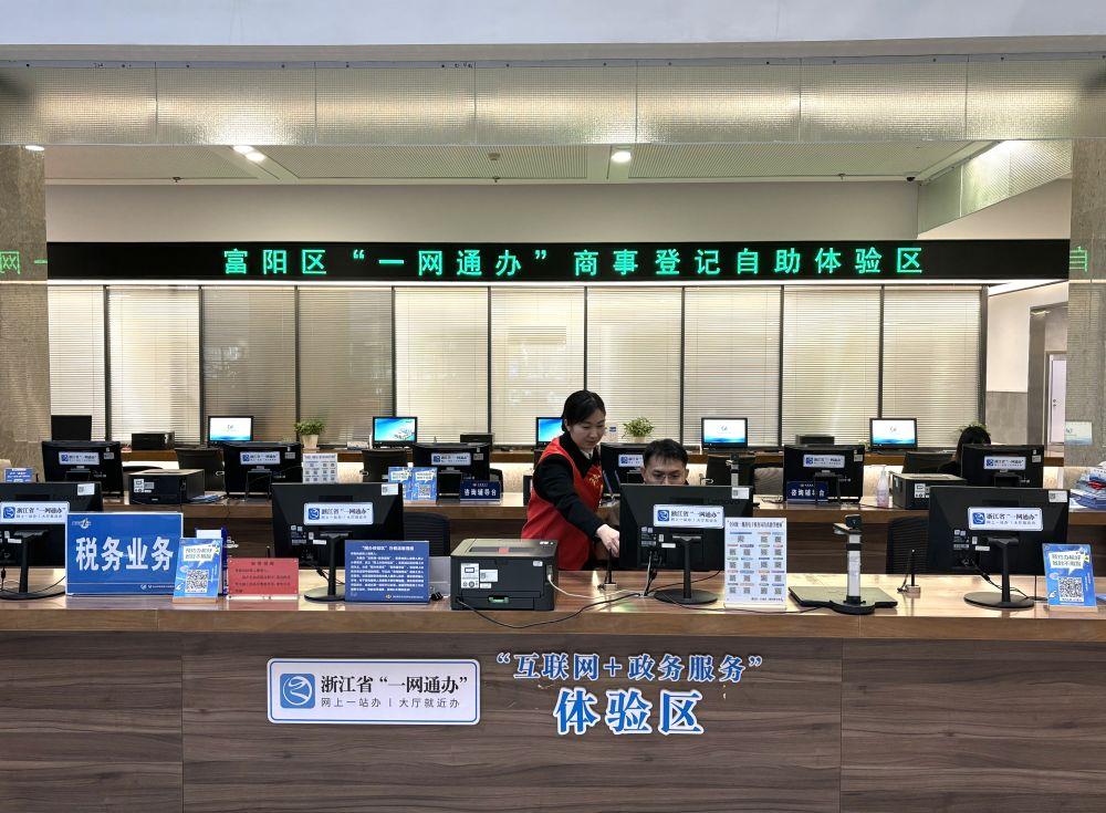 2月18日,在杭州市富阳区政务服务中心,工作人员引导群众自助办理“一网通办”事项。(受访单位供图)